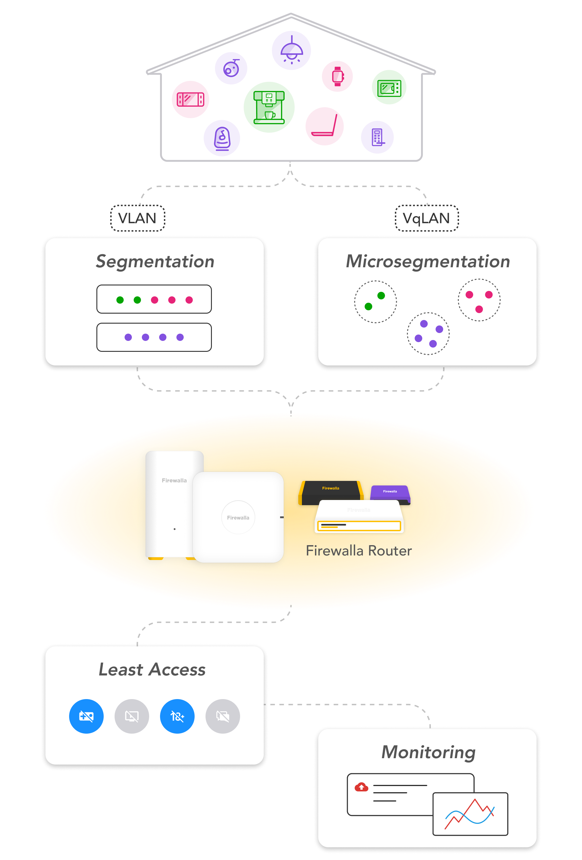 Zero Trust Networks should never fully trust any devices on the network. After your network is segmented and isolated, you can use Firewalla Rules or Policies to grant the device only the minimum permissions needed to reduce security risks.