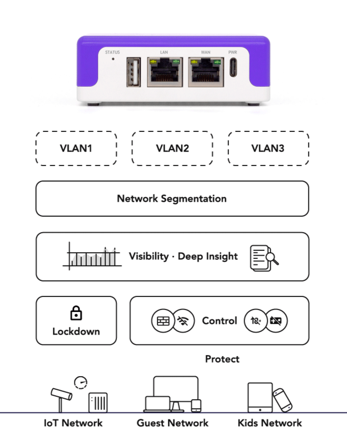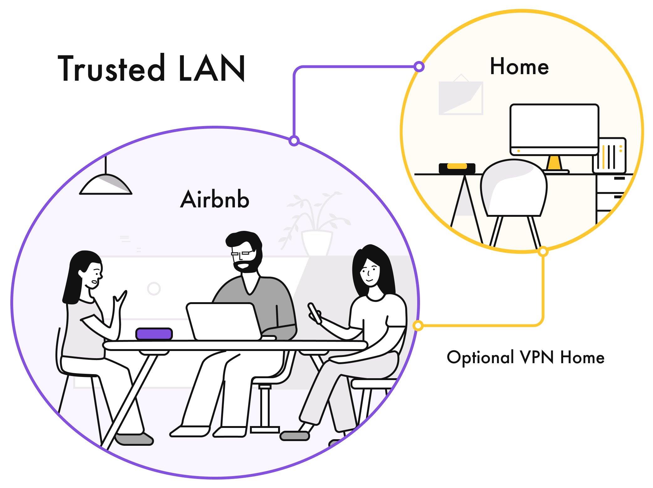 Take the Purple SE with you to make public networks safer with a trusted LAN. A trusted LAN is a network segment that's fully under Firewalla's protection, enabling you to have full visibility and control of everything flowing through it.
